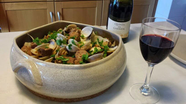 2 colheres de sopa de massa de alho e o fundo do wok bem regado de azeite. Numa caçarola, uma couve brócolo a cozer em água e uma pitada de sal. Couve cozida, escorrida e reservada e de seguida, esparguete a cozer naquele caldo, al dente, que depois também se escorre e reserva. Entretanto no wok, e já com o azeite quentinho e o alho a querer crepitar, atira-se lá para dentro com uma cenoura grande bem ralada, uma tigela de berbigão descascado e congelado e outra tigela de mexilhão também descascado e congelado. Tapa-se o wok e deixa-se suar por uns minutitos. Junta-se-lhes uns palitos, acho que foram seis, de delícias do mar cortados em rodelas grossas e logo vão os brócolos também. Mexe-se tudo com jeitinho e a ajuda da colher de pau e molha-se o dedo bem lavado naquele preparado e tenta-se a todo o custo que venha um berbigão agarrado. Vai-se outra vez com o dedo à "ferida" e agarra-se um mexilhão. Hummm... Mnhammm mnhammm mnhammm... A prova é satisfatória. Nem se vão usar as ervas que já estavam ali a jeito que o sabor estava óptimo. O esparguete cozido al dente junta-se ao festim e envolve-se delicadamente de modo a ser bem recebido. A música que toca abana o wok provocando um passo de dança profissional naquele grupo de baile amador e, vamos lá fazê-los suar todos mais um minuto ou dois com a tampa por cima. Diz que suar faz bem... Polegar e indicador, esses atrevidos de serviço, pescam um fio do esparguete e levam-no aos lábios, esses porteiros da gula, que o sugam sem dó nem piedade. Nem vai precisar do molho! Que é logo ali descartado, o desgraçado, danadinho para entrar na dança.